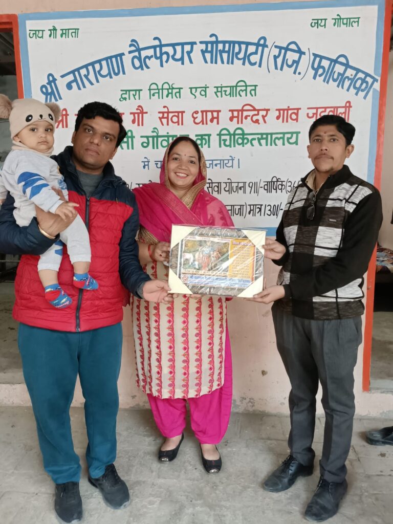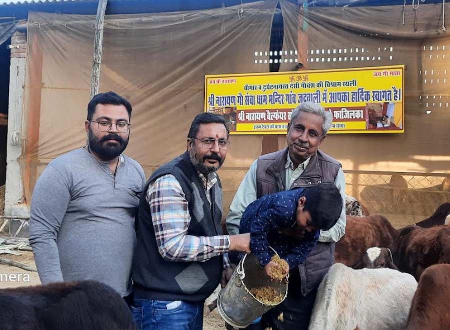 गौ सेवा व मानवता की सुख समृद्धि में काम कर रही श्री नारायण वैल्फेयर सोसायटी की ओर गाँव जट्टवाली में बनाए गए देसी गौवंश के चिकित्सालय श्री नारायण गौ सेवा धाम मन्दिर में बिमार व दुर्घटनाग्रस्त देसी गौवंश के लिए अत्यंत पौष्टिक आहार पंचरत्न सवामणी के प्रति गौ भक्तों का रूझान बढ़ रहा है, गौ भक्त हर सुख-दुःख के मौके पर गौ माता को अपने परिवार का हिस्सा मानकर सवामणी करवाकर गौमाता का आशीर्वाद प्राप्त कर रहे हैं। आज एक आनलाईन पंचरत्न सवामणी की सेवा इन्दौर निवासी अकाशदीप रंगबुल्ला ने अपने पिता श्री सुभाष रंगबुल्ला की पुण्य तिथि करवाई व एक की सेवा फाजिलका के गुम्बर परिवार ने करवाकर आशीर्वाद प्राप्त किया।